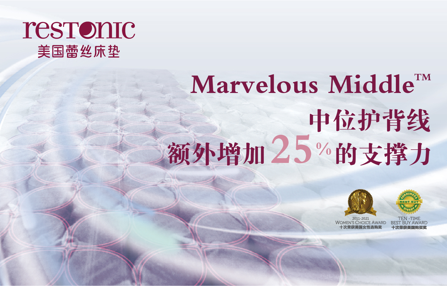 Restonic1965年时,正式注册世界专利 — 中位护背线结构(Marvelous Middle)。此后,中位护背线系列商品立刻风靡全球,时至今日,中位护背线专利结构依然是其他床垫品牌难以超越的优秀设计。在全球广大消费者心目中,中位护背线俨然成为健康床垫结构的代名词。