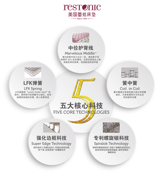 1983年进入中国市场后,改变了东方人的睡眠观念,凭借“中位护背线、LFK弹簧、簧中簧弹簧、强化边框科技、专利螺旋锁科技”五大核心科技,不断升级产品、完善服务流程,为中国消费者提供更加舒适、健康的睡眠体验,呵护国人睡眠健康。