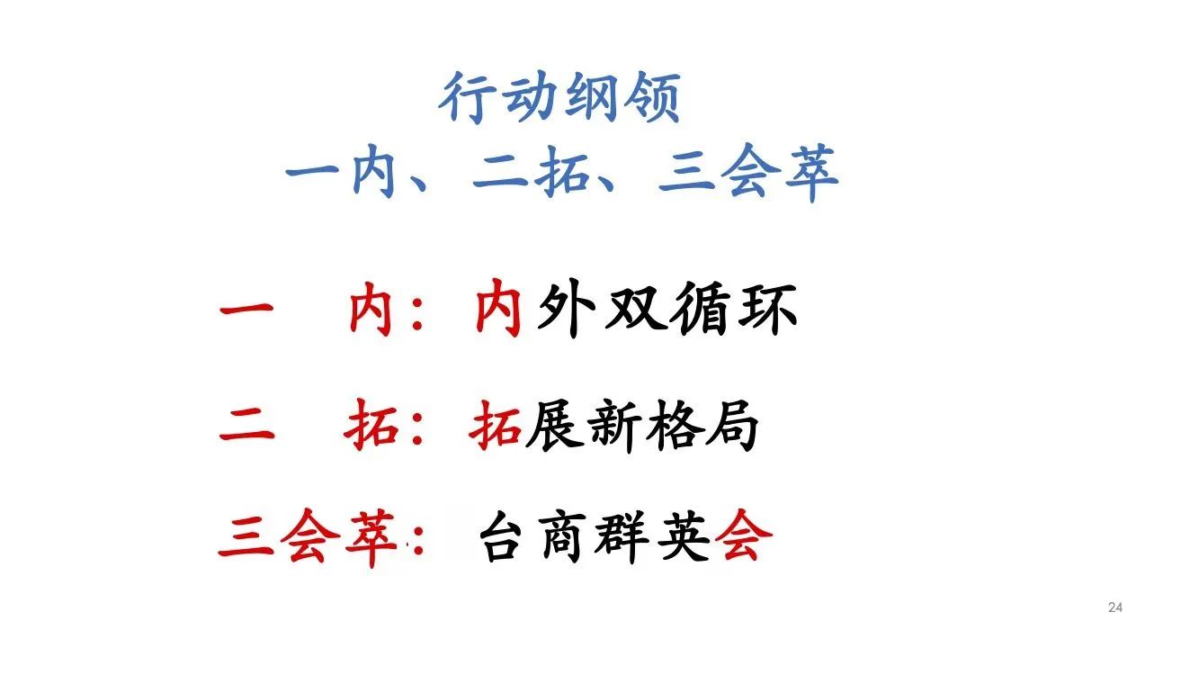 内拓会的行动纲领以“一内、二拓、三荟萃”为核心原则。首先,“一内”着重在内外双循环的基础上,推动国内市场的拓展与增强。其次,“二拓”则集中于开拓新的市场格局,适应“双循环”战略的需求。最后,“三会萃”则代表着台商群英会,一个为台商提供交流合作的平台。通过这一坚定的行动纲领,内拓会将引领台商在内销拓展领域取得更为卓越的成就。