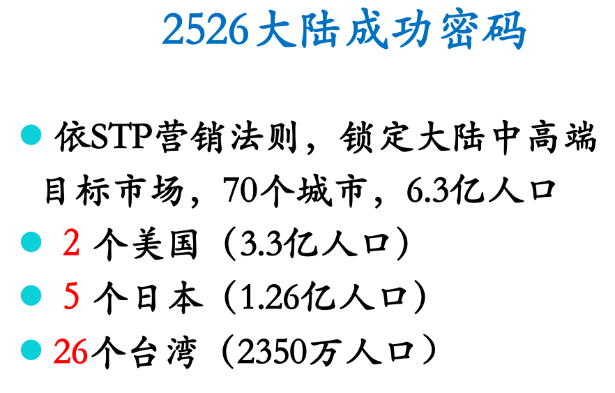 在内拓会,陈燕木主委提出了“2526大陆成功密码”,作为成功的路径指南。根据STP营销法则,陈主委精准地锁定了大陆中高端市场,这个市场庞大无比,覆盖了70个城市,总人口高达6.3亿,相当于2个美国、5个日本,以及26个台湾的市场规模。